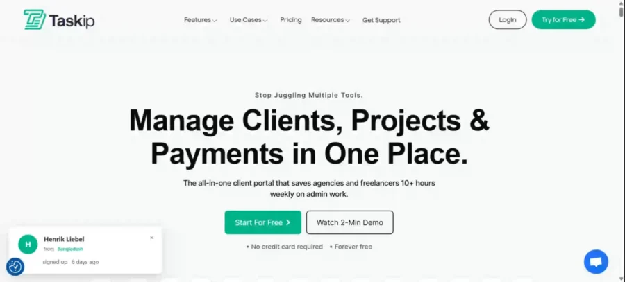 Taskip is an agency management and client portal software built for freelancers and digital agencies. Instead of juggling multiple apps, Taskip brings everything together across sales, CRM, projects, booking, billing, communication, support, and automation into one simple and connected workspace. It is a smarter and easier way to run your agency and serve your clients.