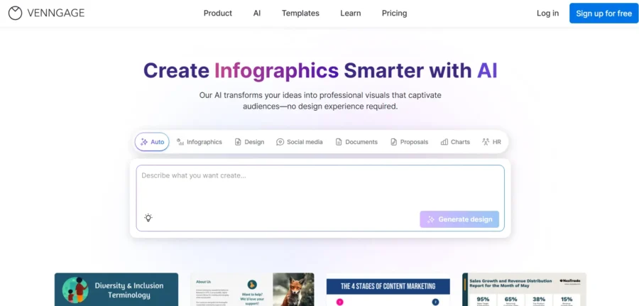 Venngage is an all-in-one AI design platform with 100+ tools for creators, marketers, business owners, and academics. With a single prompt, it turns text into clear visuals – infographics, charts, diagrams, and supporting graphics – so your content is engaging and easy to understand.