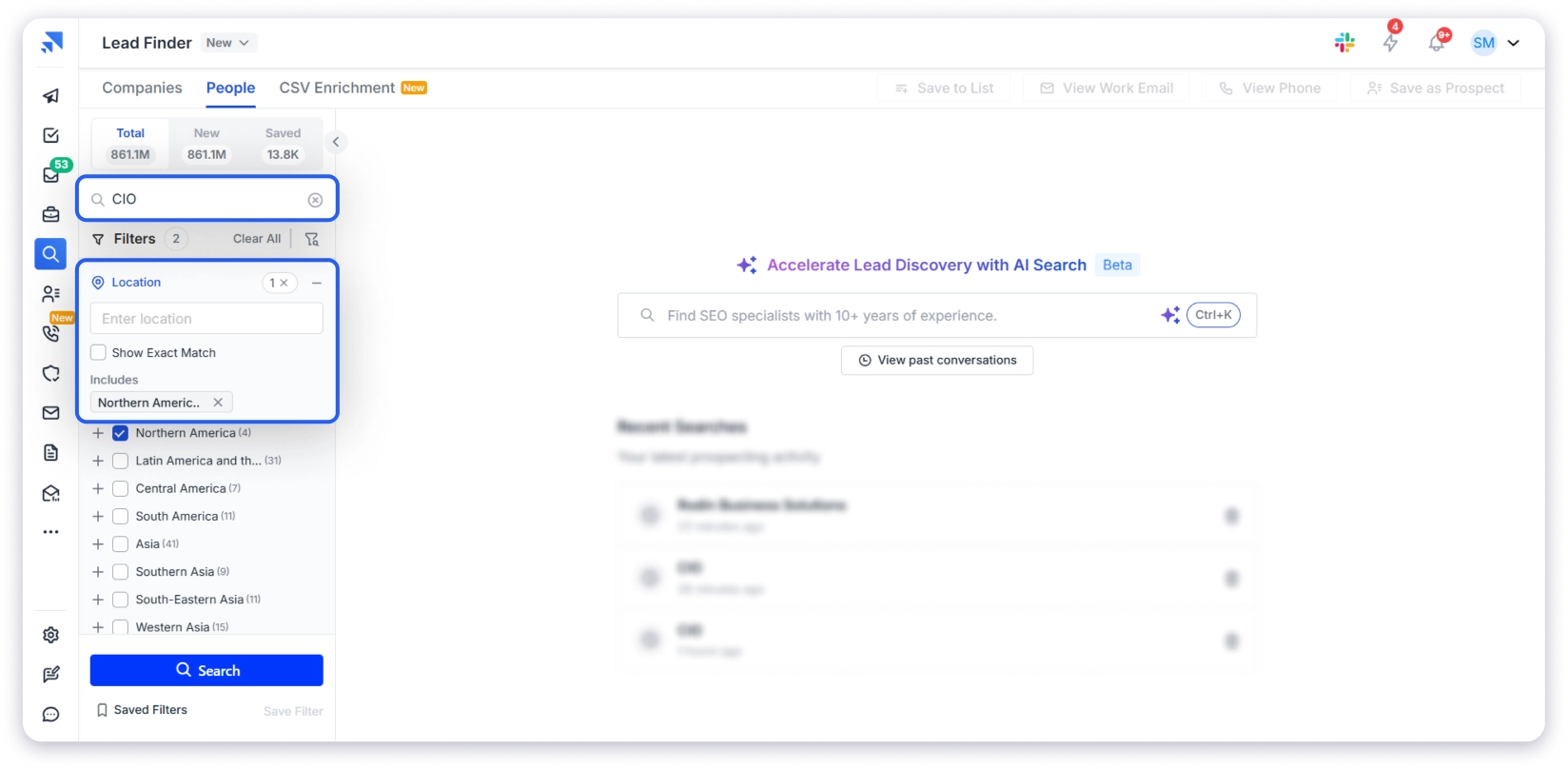 Step 1: Open Lead Finder. Click the People tab. Type “CIO” in the job title. Set the location to the United States.