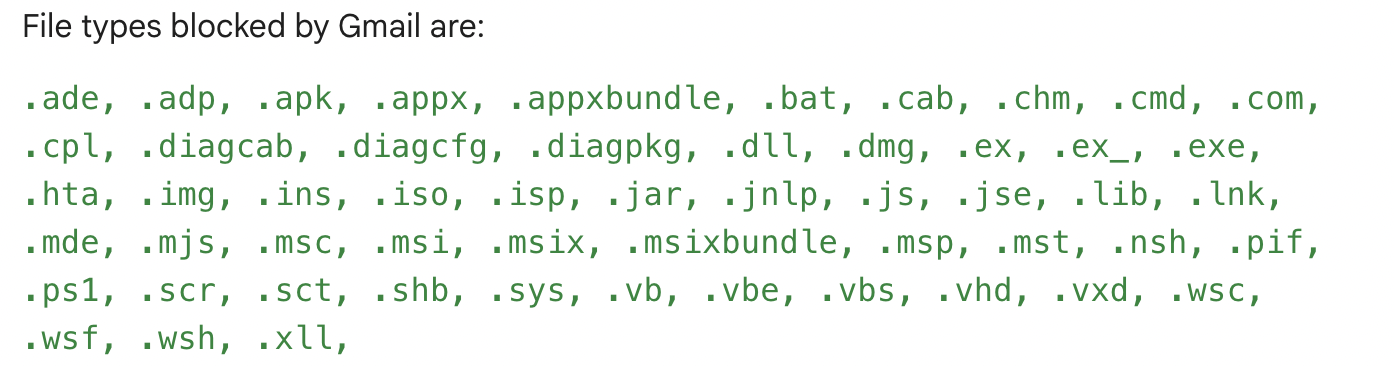 Basically, Gmail will block any attachment that could potentially run code on the recipient’s computer.