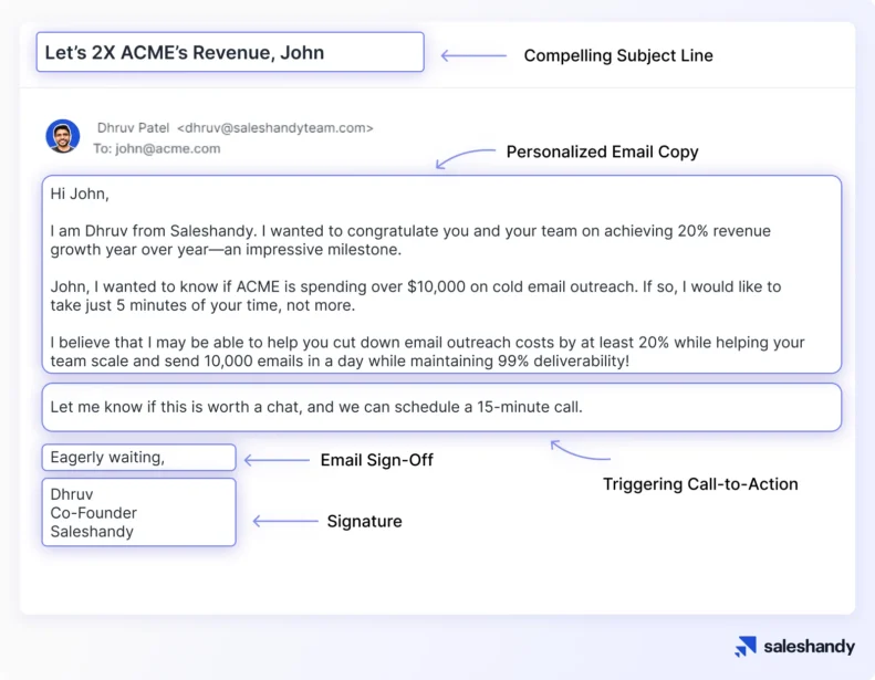 - An action-oriented Call to Action (CTA) to guide your prospects to the next step they should take, whether booking a meeting or simply replying to your email.