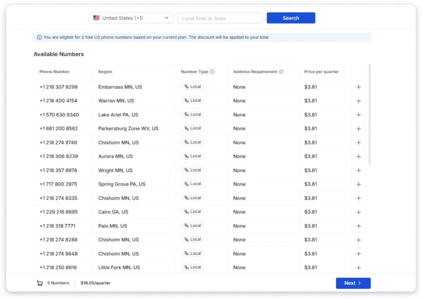 1. Search by country and optionally filter by area code or region name to find numbers that match your target market