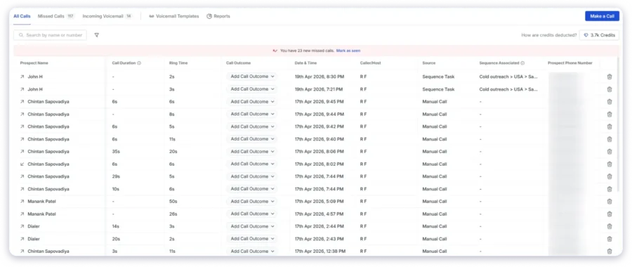 A unified log of every outgoing call, incoming call, missed call, and voicemail drop, from all team members, all sequences, and all manually dialed numbers. Each row in the log shows the prospect name, call type (outgoing, incoming, missed, voicemail), call duration, ring time, call outcome, date and time, which team member made the call, which sequence it came from (or ‘Manual Call’ if dialed directly), and the phone number used.