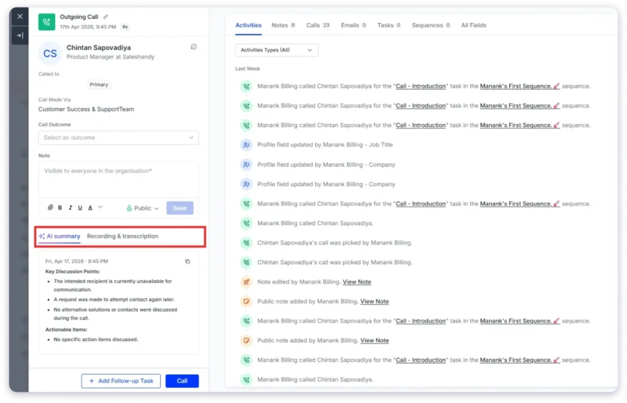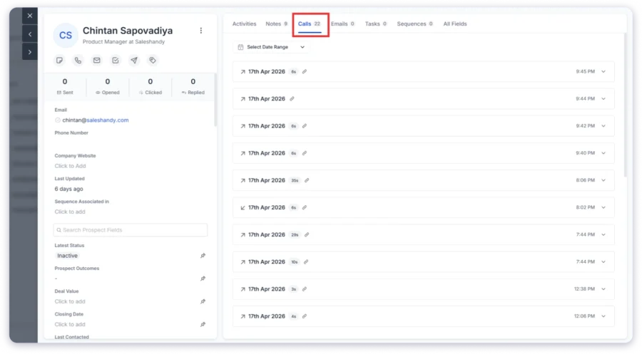 Every call made or received through the Saleshandy Dialer is automatically logged to the CRM. This means your prospect’s profile page always shows the complete picture, every email sent, every reply received, every LinkedIn touchpoint, and every call, in a single, chronological activity timeline.
