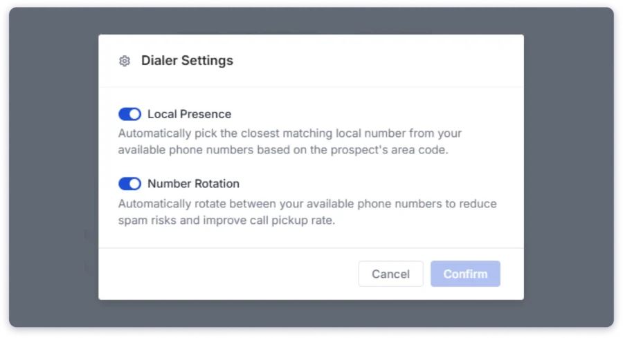 • Enable Local Presence and Number Rotation from Settings if you are calling across multiple regions or want to distribute call volume