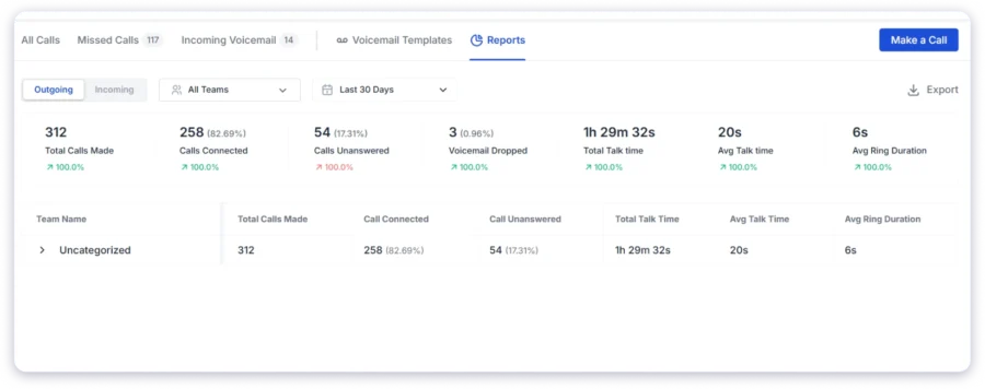 The Dialer includes a dedicated reporting module accessible from within the Dialer dashboard. It covers both outgoing and incoming call performance, viewable at team level and individual level.
