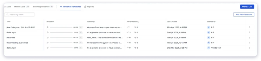 Displays all voicemails received from prospects. Each entry shows the caller’s name, an inline audio player with playback speed control, a transcript preview (expandable or copyable), the date and time, and the caller’s number. New voicemails show a red dot and trigger the same sidebar badge system as missed calls.