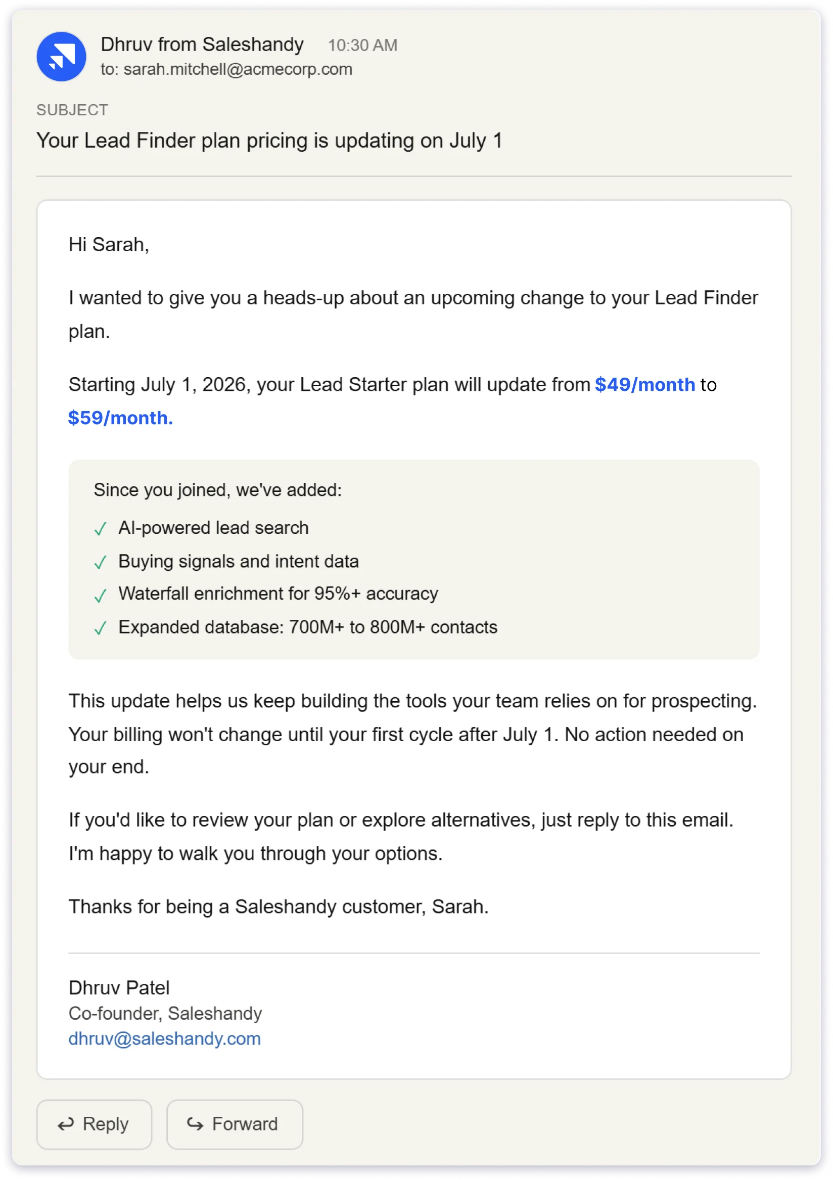 To keep building at this pace, we’re updating our pricing starting [Effective Date]. Your [Plan Name] will move from [Old Price] to [New Price].