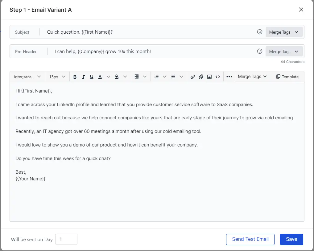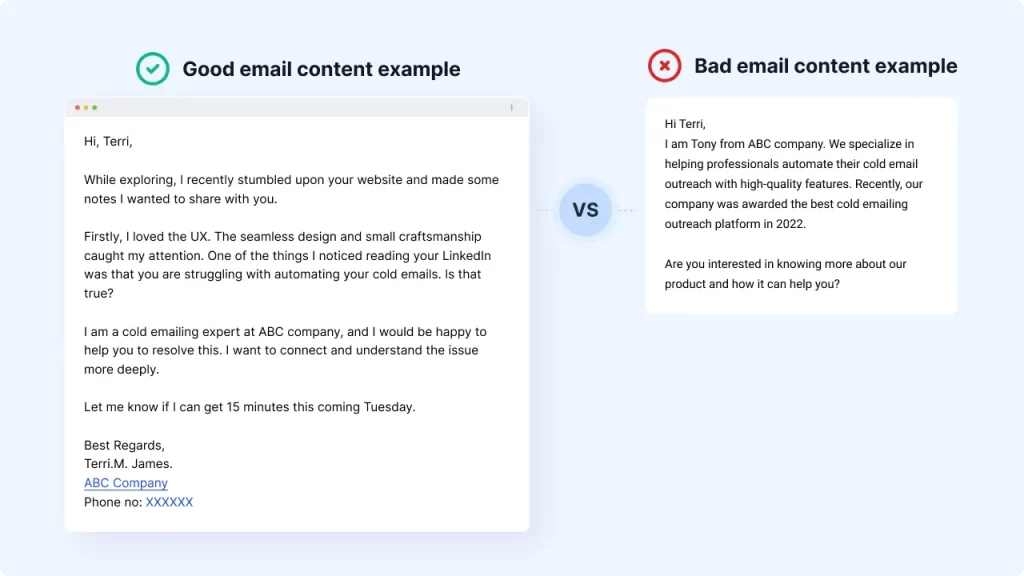 Writing with your best foot forward, you can go in-depth and helpfully present your product. Personalize your content as much as possible based on your research, use mail merge tags (first name, last name, location, phone number, etc.), avoid using spam-triggering words, and keep your email length around 100 words.