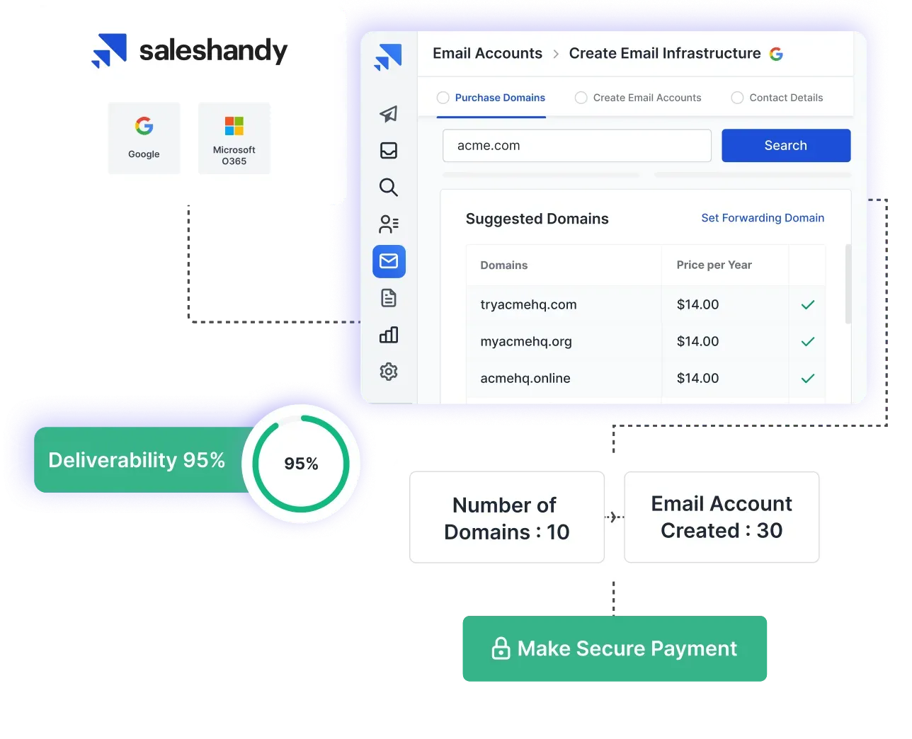 Easily select and purchase secondary domains and email accounts directly from Saleshandy – no technical setup required.